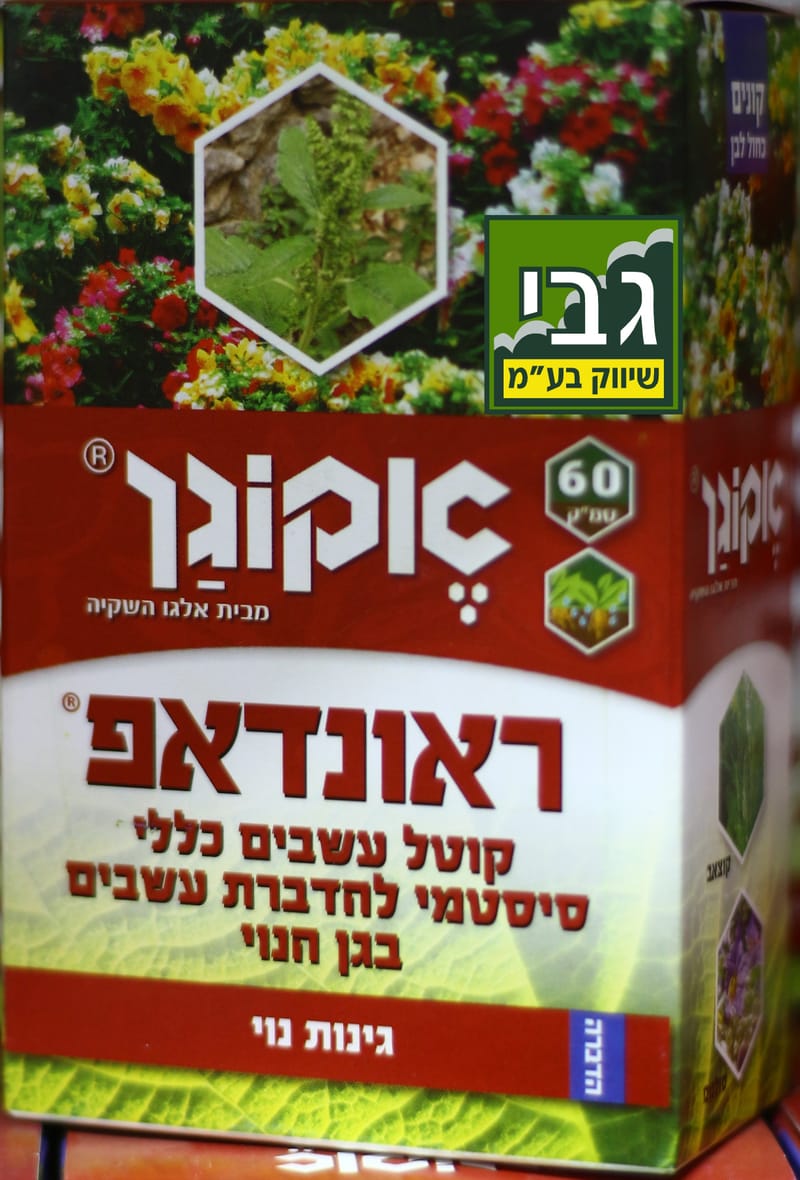 אקוגן ראונדאפ תרכיז 60 סמ"ק - קוטל עשבים סיסטמי לא בררני התכשיר: - מכיל: 480 גרם בליטר Glyphosate. - מדביר עשבים סיסטמי לא בררני . - נקלט דרך העלווה הירוקה, מובל מטה לבית השורשים וע"י כך הורג את הצמח. - מדביר את מרבית העשבים הקיימים למעט נזמית, סרפד, חלמית מפותחת, ינבוט והגא. - שילוב הראונדאפ עם הטומהוק משפר את הדברת הסעידה. אופן היישום: - ריכוז התרסיס המוכן: 30 סמ"ק לליטר מים. - מלא כ-1/3 מנפח המרסס במים. - נער את הבקבוק. - השלם את כמות המים החסרה. - רסס במרחק 1/2 מטר מהצמח, עם כיוון הרוח. - לאחר הריסוס יש להימנע מהשקית המטרה במשך יומיים. - רצוי לרסס לאחר השקיה