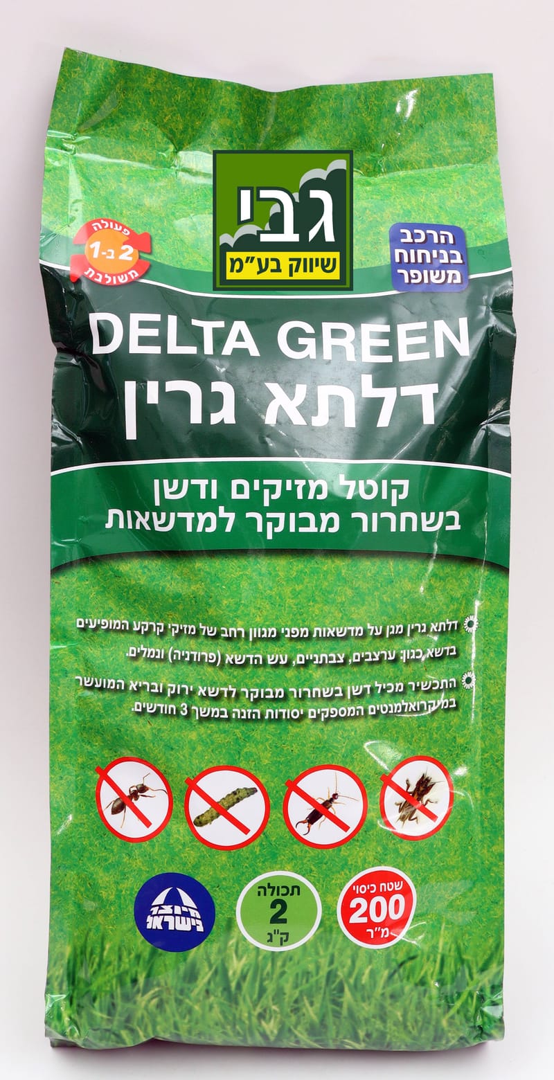 דלתא גרין - דורקי באריזה של 2 ק"ג במבצע קוטל מזיקים ודשן מדשאות באריזת 2 קילו גרם המתאימה לשטח של 200 מ"ר פעולה כפולה במוצר אחד: מדשן מדשאה ארוך טווח (3 חודשים) ומשמיד מזיקי קרקע. מעולה לטיפול בפרודניה, מחסל ערצבים, צבתניים, עש הדשא נמלים ומזיקים שונים, מדשן ומחזק את המדשאה. דלתא גרין דורקי קוטל מזיקים ודשן למדשאה * קוטל חרקים קיימים ומונע התרבות מזיקים חדשים * דשן בשחרור מבוקר המספק הזנה למשך 3 חודשים ביחס הזנה אופטימלי * בעל רמות אשלגן גבוהות להגברת עמידות בתנאי עקה * בעל רמות חנקן גבוהות למתן צימוח אופטימלי