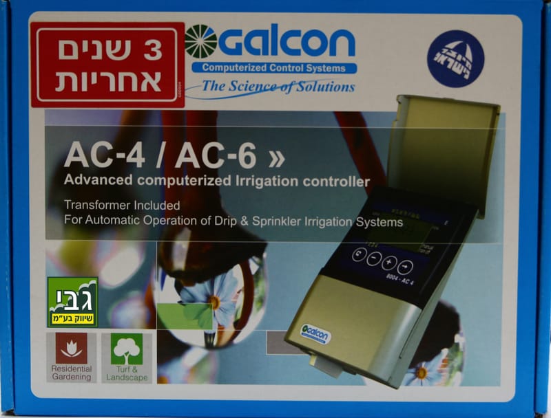מחשב השקיה גלקון AC4 מארז הכולל את הבקר והשנאי (ללא ברזים) שלוש שנות אחריות גלקון.