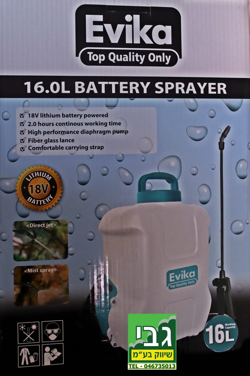 מרסס גב איכותי נטען 16 ליטר אביקה EVIKA עם סוולה איכותית ועוצמתית 18V ליתיום בהספק 2.5 אמפר שעה המספיקה לשעתיים של ריסוס רצוף (כ 10 מרססים מלאים) EVIKA 18V 2500MA LITHIUM BATTERY המרסס קל משקל ומתאים לחקלאות, גינון, חיטוי וניקוי. פתרון יעיל ונוח לריסוס עשבייה ולהדברת חרקים בנוחות יעילות וקלות. ספיקת דיזה ישירה: 1.45 ליטר לדקה, זמן ריסוס למרסס מלא כ 11 דקות ספיקת דיזת ספריי : 1.12 ליטר לדקה, זמן ריסוס למרסס מלא כ 14.30 דקות.