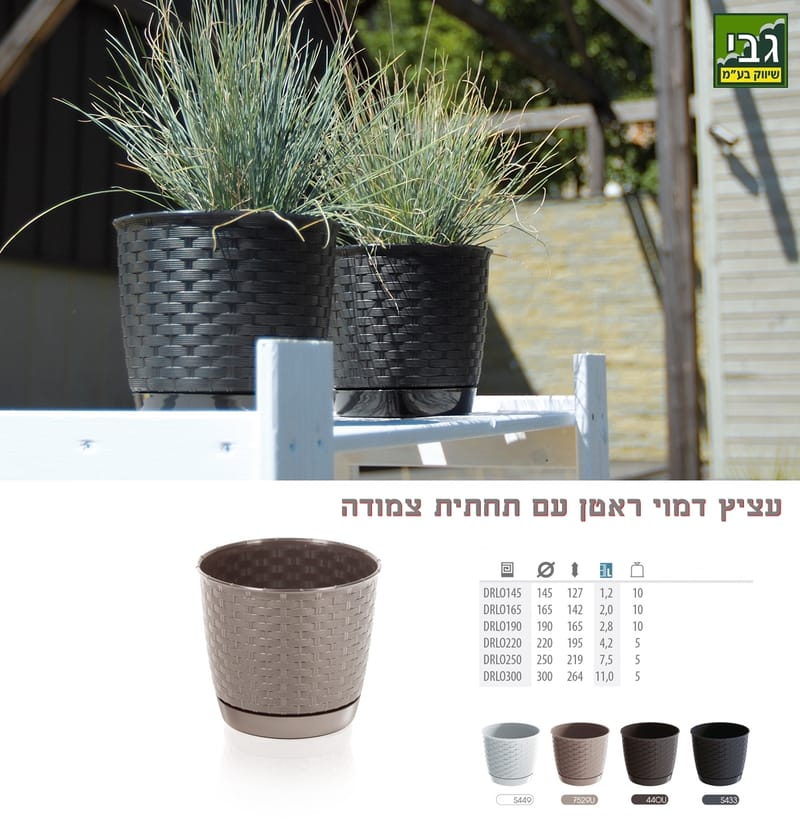 עציץ ראטן כולל צלחת צמודה להשיג בצבעים: לבן, חום כהה, מוקה וענתיק ומגוון גדלים ( מפרט בתמונה ראשית) : עציץ ראטן כולל תחתית 15 ס"מ, עציץ ראטן כולל תחתית 17 ס"מ, עציץ ראטן כולל תחתית 19 ס"מ, עציץ ראטן כולל תחתית 22 ס"מ, עציץ ראטן כולל תחתית 25 ס"מ, עציץ ראטן כולל תחתית 30 ס"מ.