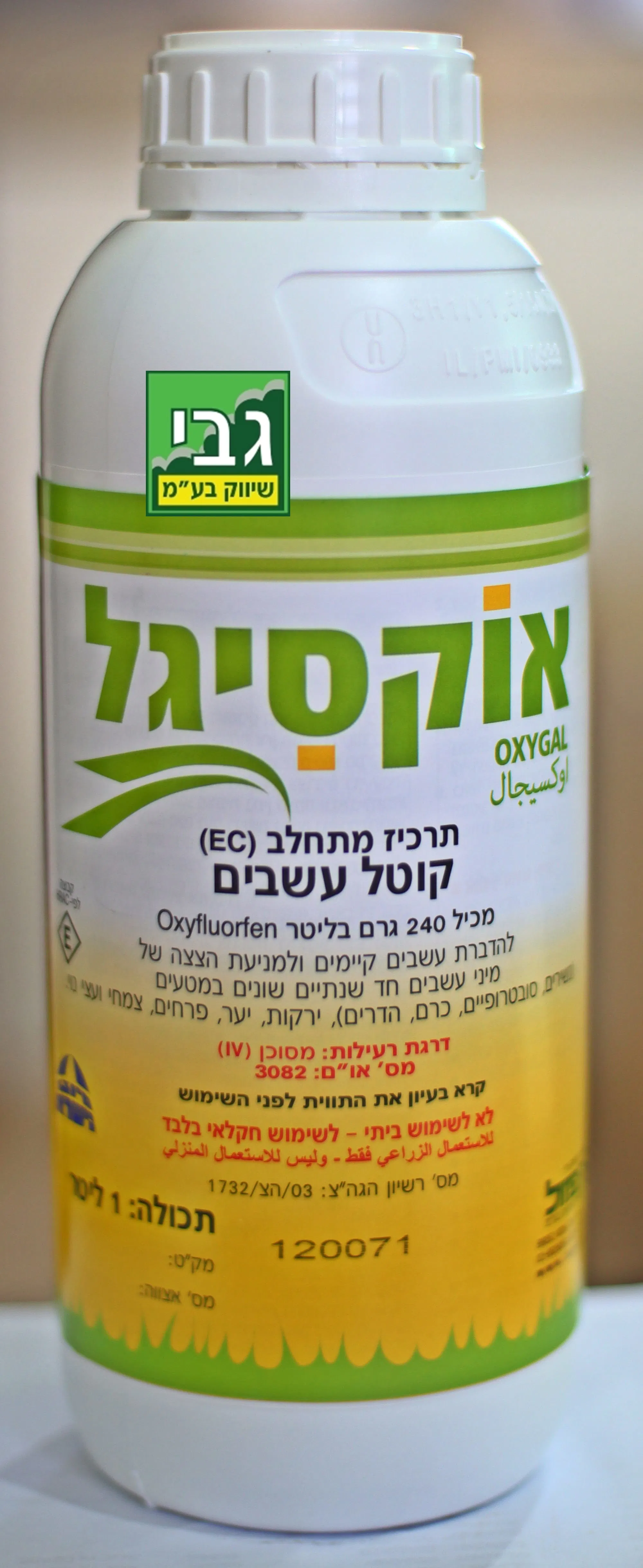 אוקסיגל להדברת עשבים קיימים ולמניעת הצצה של מיני עשבים חד שנתיים שונים במטעים (נשירים, סובטרופיים, כרם, הדרים), ירקות, יער, פרחים ועצי נוי אוקסיגל מופעל מהסתיו ועד האביב בהמטרה או בגשם. התכשיר מונע את הצצת העשבים הבאים לתקופה ממושכת בהתאם לעונה ולמינון ויקטול את העשבים שגובהם עד 10 ס"מ (למעט הדגניים שרק הצצתם תימנע): 1.רחבי עלים: חלבלוב קעור, ענבי שועל, אבוטילון, חבלבל (מזרעים), לכיד, דטורה, חלמית, מעוג, ירבוזים, רגלת, לשישית הצבעים, ארכובית, בר גביע, מרור הגינה, מצליבים (למעט שחליל שרוע), סביון, אמיך קוצני, נזמית, סרפד, ברקן, עשנן, גדילן. 2.דגניים: שיבולת שועל, חפורית, דוחנית השלחין ואצבען מאדים. השיבוש בחבלבל ובירבוז הרכב: Oxyflurofen 240 גר/ל