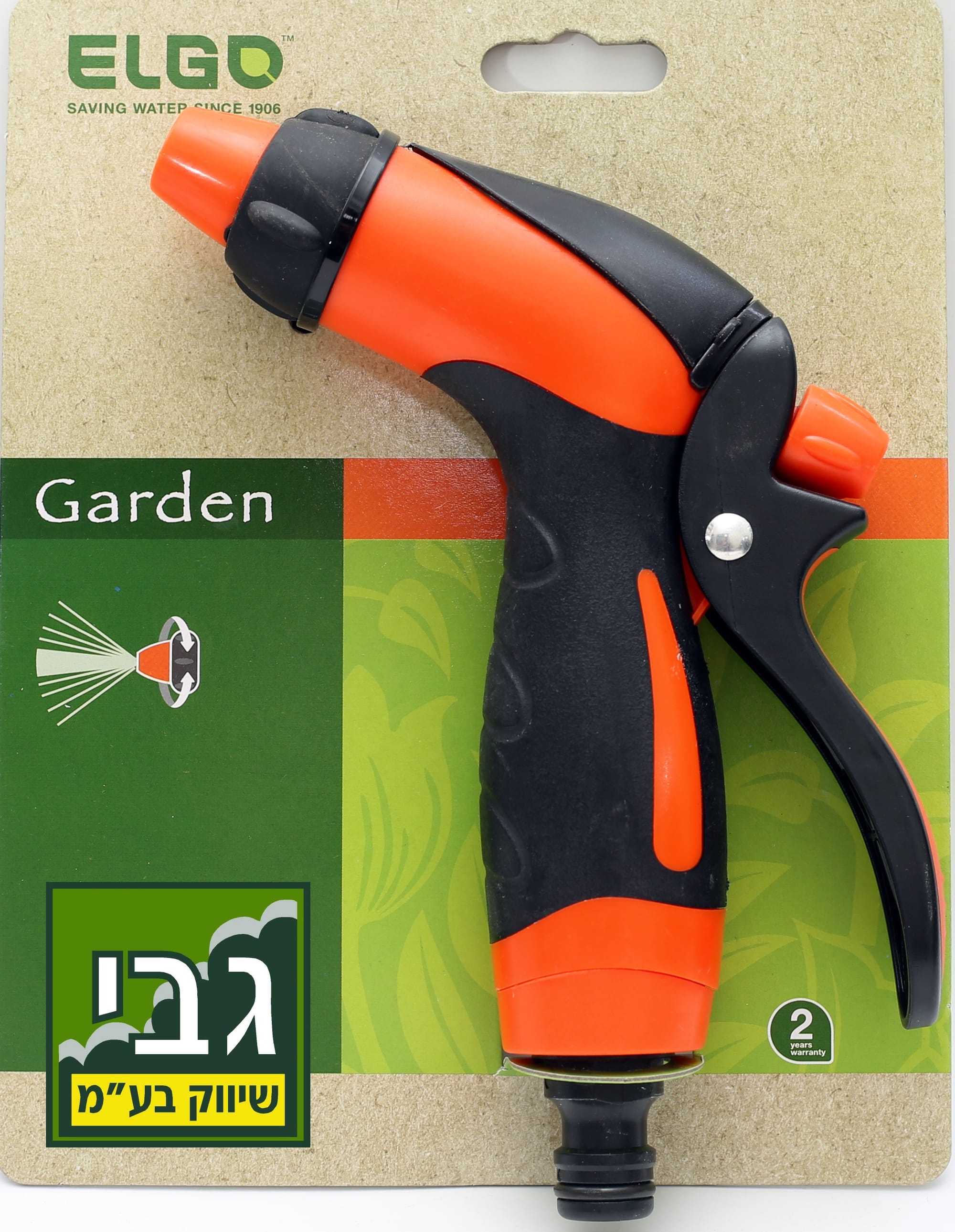 אקדח השקיה פלסטיק עם ידית משולבת גומי למניעת החלקה ואחיזה נוחה.