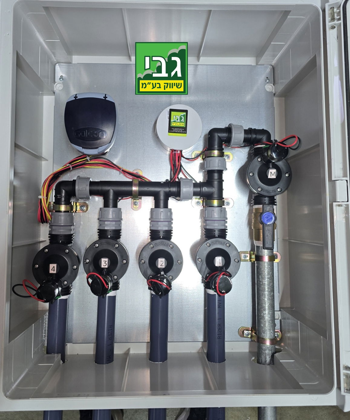 מערכת השקיה איכותית מורכבת בארון קומפלט עם 4 קווי השקיה / שטיפה וברז מאסטר חשמלי נוסף לאבטחה ושמירה כפולה מפני התפרצות מים ותקלות.
