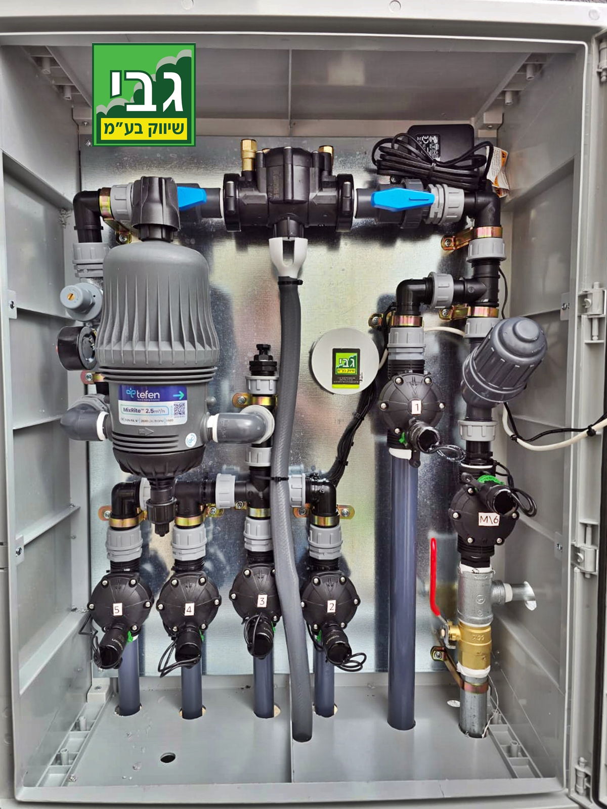 ארון השקיה מקצועי הנטר WIFI HUNTER עם דישון תפן ומז"ח אר"י קומפלט מערכת השקיה חכמה בארון מקצועי, המערכת מורכבת עם מחשב השקיה אינטרנטי של הנטר וויפיי מדגם HC-601I-WI-FI כוללת משאבת דשן תפן (משאבה הידראולית פרופרציונלית ללא צורך בחשמל - אפשרות גם למשאבה חשמלית), מונע זרימה חוזרת אר"י, ברז מאסטר חשמלי, מסנן עמיעד, ועוד 5 ברזים להשקיה - כמות וחלוקת ברזי טפטוף או המטרה לבחירה.