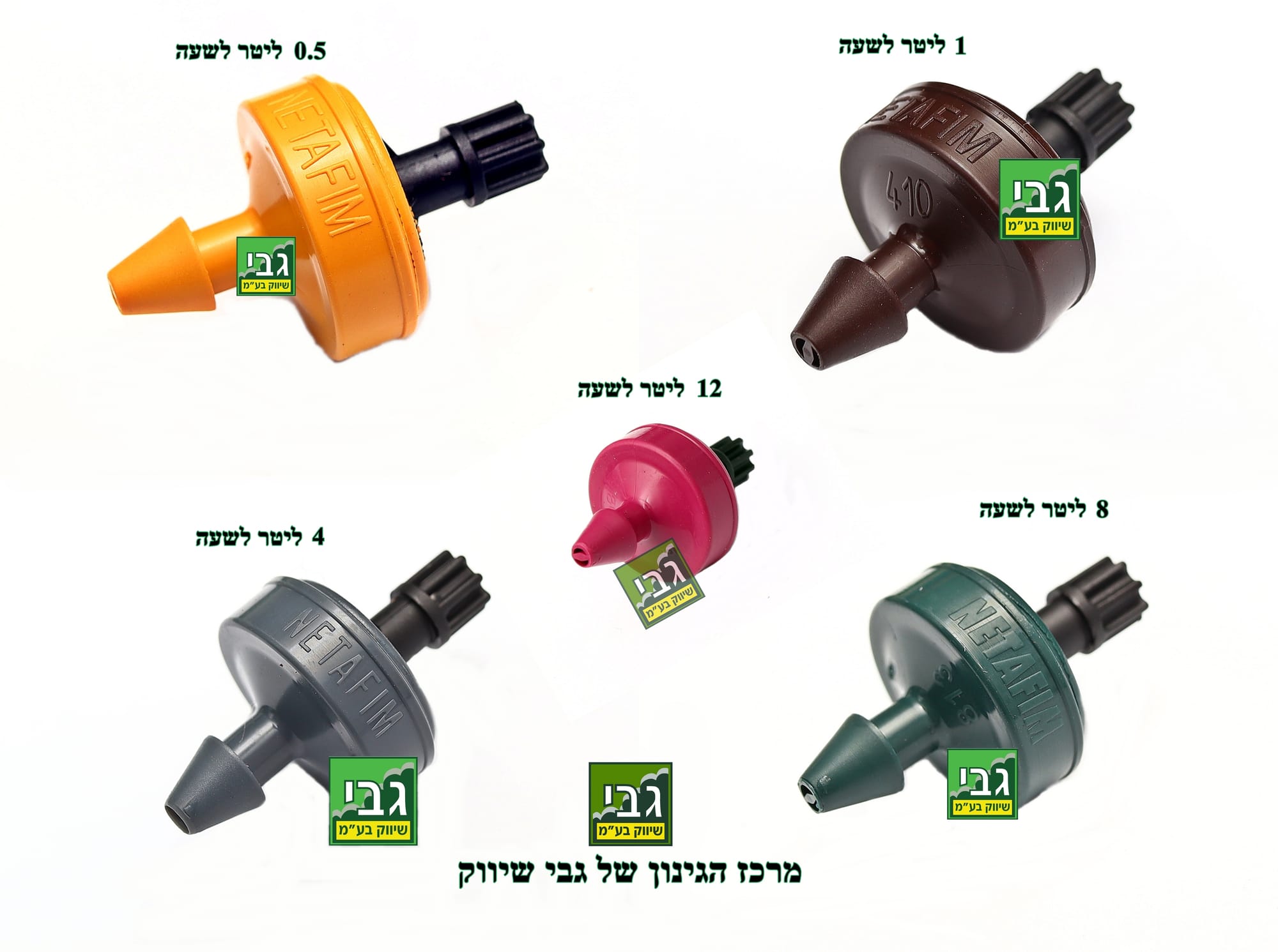 טפטפות כפתור ננעצת (טפטפת מידי PCJ) מווסתות מהדור החדש של נטפים PCJ NETAFIM, להשיג בספיקות של : טפטפת ננעצת 0.5 ליטר שעה ליטר לשעה צבע צהוב טפטפת ננעצת 1 ליטר שעה ליטר לשעה צבע חום טפטפת ננעצת 2 ליטר שעה ליטר לשעה צבע אצום טפטפת ננעצת 4 ליטר שעה ליטר לשעה צבע שחור/אפור טפטפת ננעצת 8 ליטר שעה ליטר לשעה צבע ירוק טפטפת ננעצת 12 ליטר שעה ליטר לשעה צבע סגול טפטפות עם יציאה רגילה לצינורית - מאפשרת להוליך מים לעציצים עם צינורית פי וי סי דקה 3/5 מ"מ או טפטפת עם יציאת ניפל לחיבור למפצל צינוריות כמו מפצל 2 יציאות או 4 יציאות נטפים.