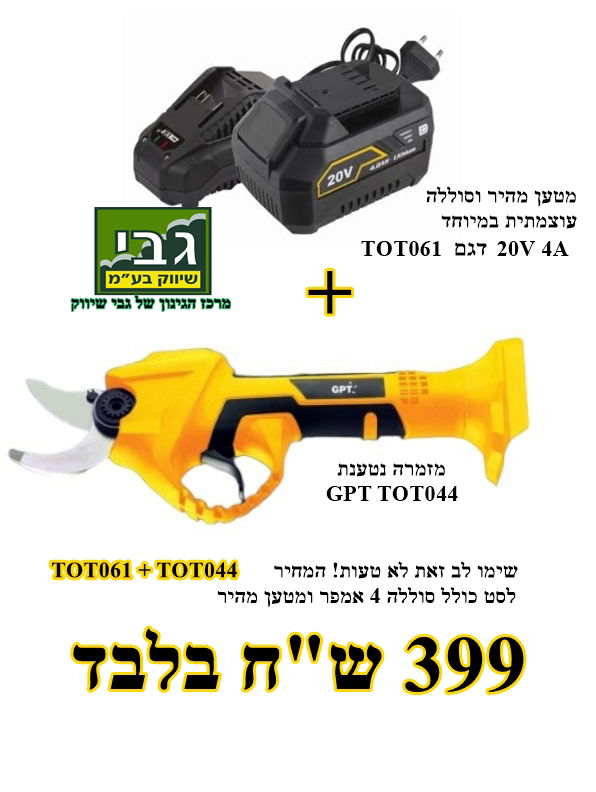מזמרה נטענת - גוזם ענפים חשמלי נטען 20V של גי.פי.טי דגם 20V GPT TOT044 בסט הכולל מטען מהיר וסוללה 20V 4A דגם GPT TOT061 במחיר ללא תחרות!
