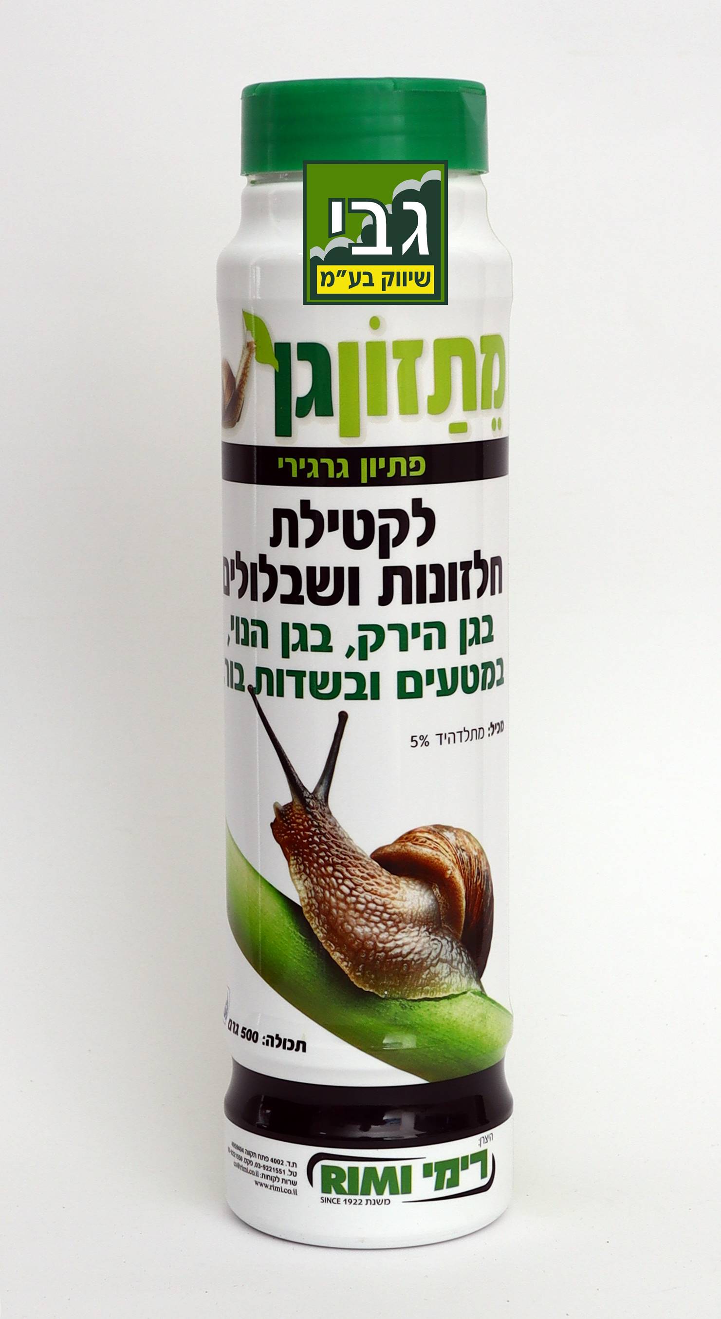 מתזון גן 500 גרם פתיון גרגרי להדברת חלזונות ושבלולים בגן הירק, נוי, מטעים ושדות. מכיל: 5%Metaldehyde. גורם להפרשת ריר ולהתייבשות החלזונות. פועל כרעל קיבה ומגע. מדביר חזק ואפקטיבי להדברת חשופיות וחלזונות.