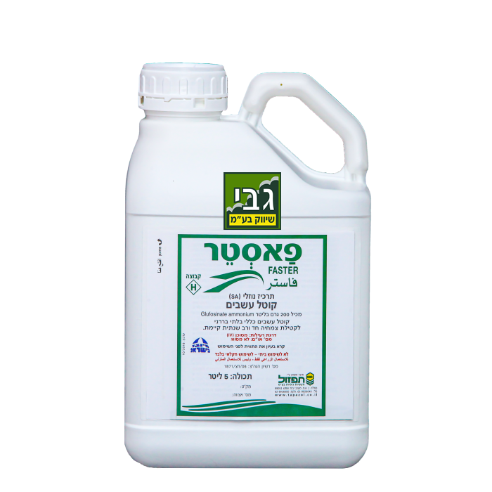 פאסטר 5 ליטר - קוטל עשבים כללי בלתי בררני לקטילת צמחים חד ורב שנתית קיימת. מכיל : 200 גרם בליטר Glufosinate ammonium כללי: פאסטר הינו קוטל עשבים כללי המיועד להדברת עשבים בפרדס, מטע, כרם, להכנת שטחים למזרע או שתילה, וטיפול בשטחים לא חקלאיים. קליטת התכשיר מתבצעת דרך חלקי הצמח הירוקים, אין קליטה דרך מערכת השורשים. עשבים רב שנתיים מרססים בשיא צמיחתם, סמוך או במשך פריחתם. עשבים חד שנתיים מרססים בגמר הצצה. להשגת יעילות מרבית דרוש שטח עלווה מספיק לקליטת התכשיר.