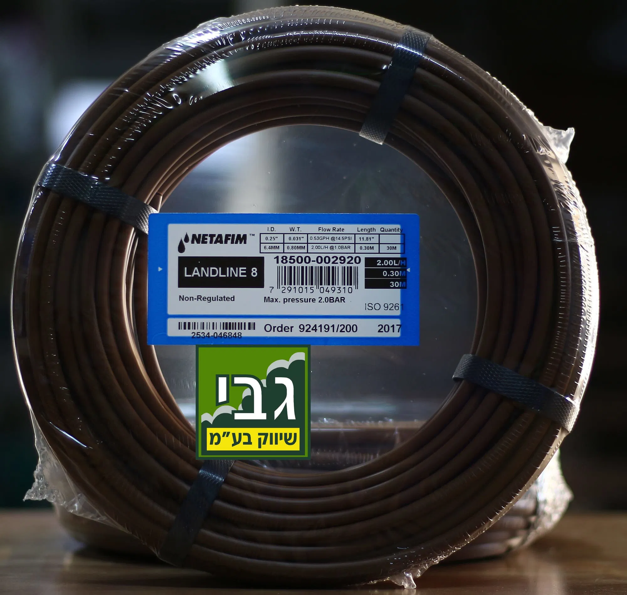 צינור לנדליין - טיפטוף זעיר 8 מ"מ ומחברים. צנרת טיפטוף זעיר 8 מ"מ להשקיה אסטטית וחסכונית של גינות, אדניות כדים ועציצים. הגלילים מגיעים באורך של 30 מטר (צינור עיוור או צינור טיפטוף במרווחים של 0.15, 0.20, 0.30 ס"מ) לצנרת לנדליין נטפים ישנם מחברים יעודיים: מחברי 8 מ"מ בתצורת שן (ישר זווית או הסתעפות טי) פיתוח ייחודי המיועד להשקיה בפסים צרים, הכולל טפטפת אינטגראלית איכותית בשלוחה בקוטר 8 מ"מ. מתאים להשקיית סוגי גידול כגון גן ירק ביתי, ערוגות תבלין או אדניות מלבניות.