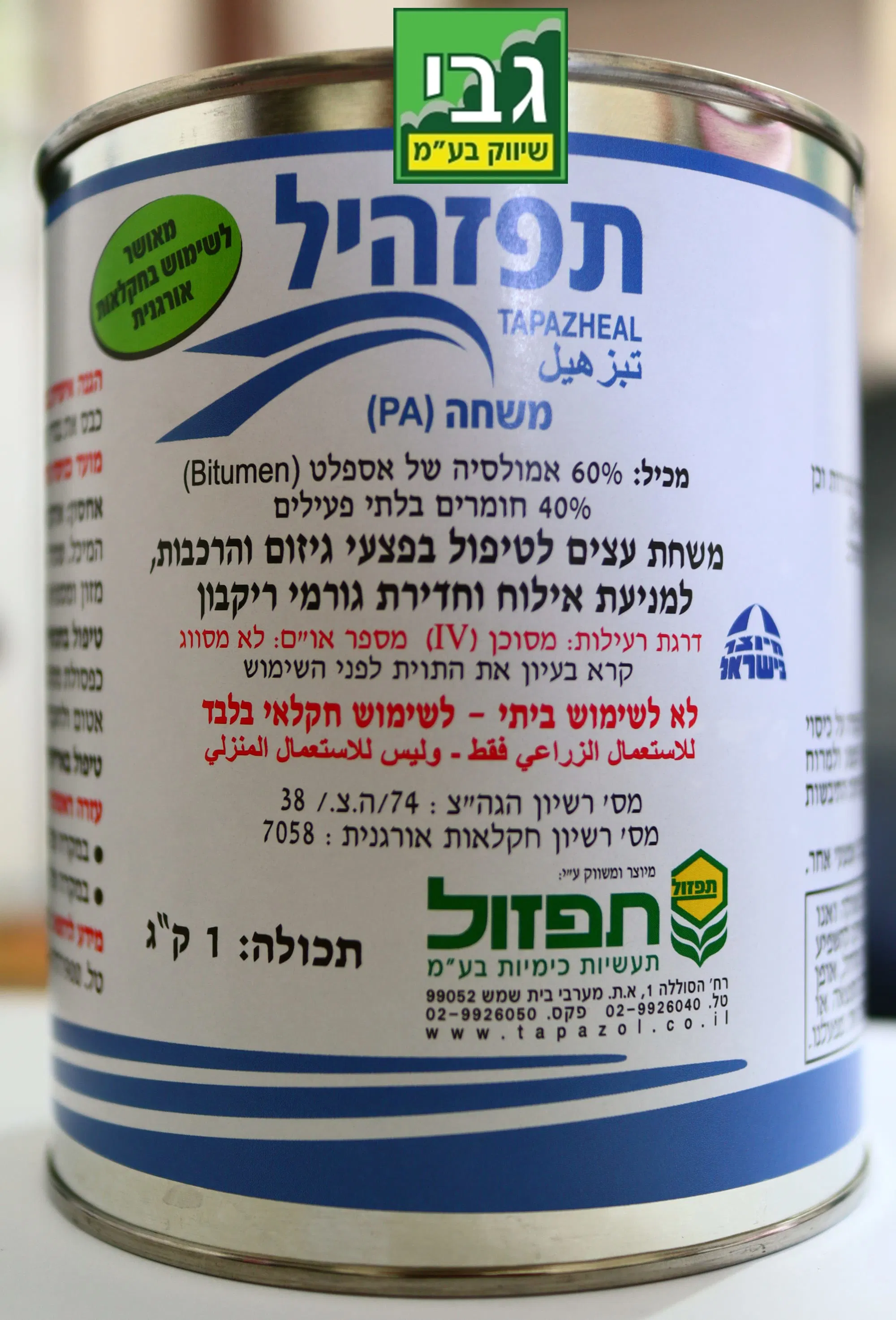 תפזהיל - משחת גיזום מקצועית 1 קילו תפזול משחת עצים לטיפול בפצעי גיזום והרכבות למניעת אילוח וריקבון. משחת הגיזום תפזהיל של תפזול מאושרת לשימוש בחקלאות אורגנית TAPAZHEAL PA 60% BITUMEN
